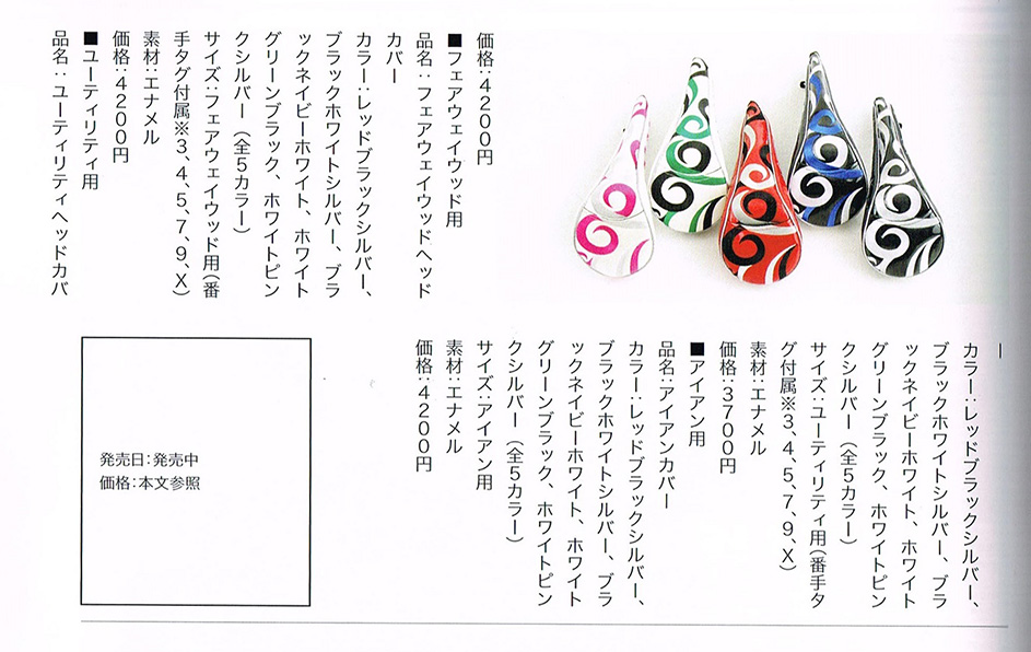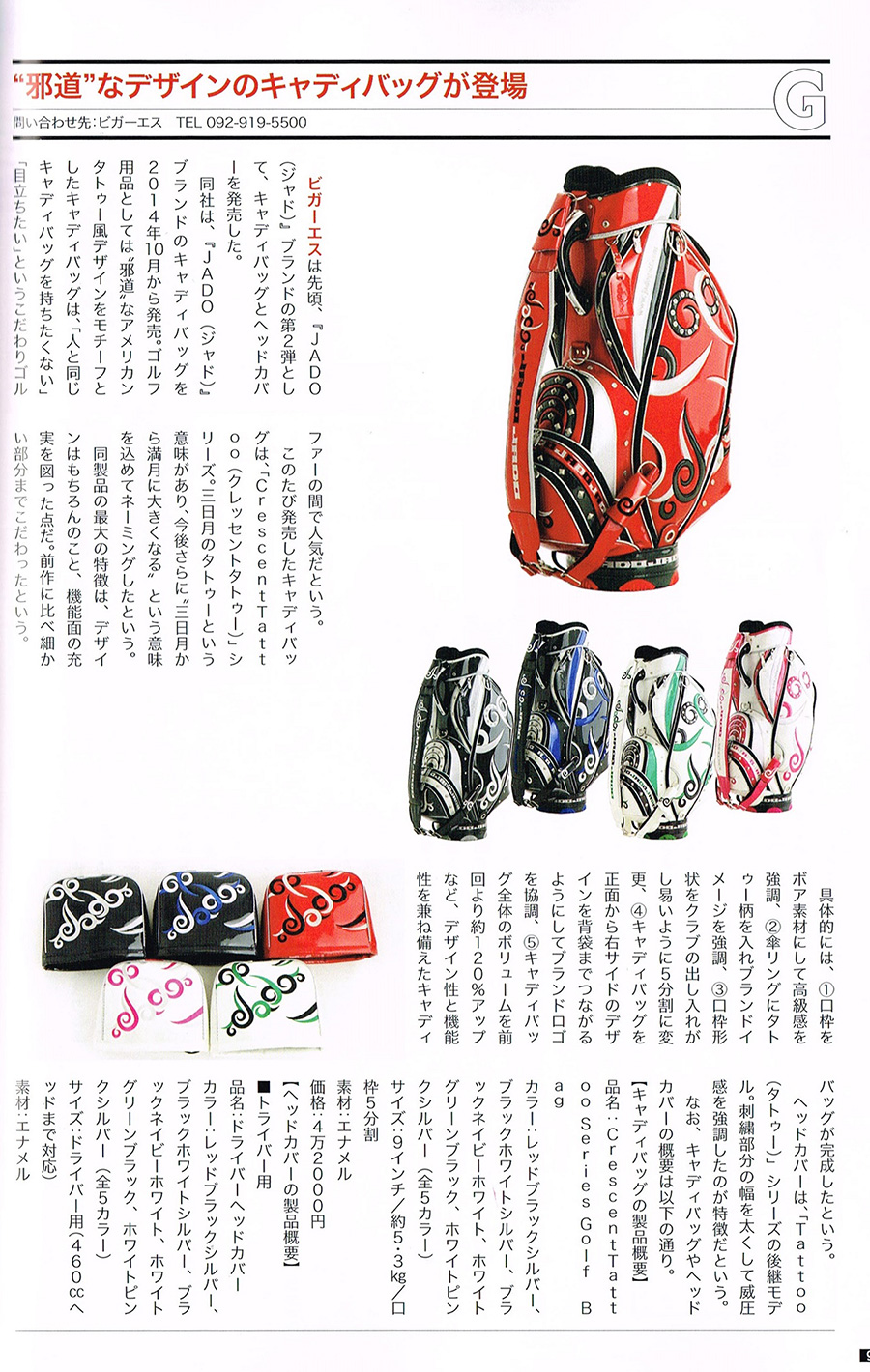 「人と同じキャディバッグを持ちたくない」「目立ちたい」というこだわりこだわりゴルファーの間で人気とキャディバッグ5種類と、ヘッドカバーの写真を掲載、他の商品も文章で紹介していただきました。